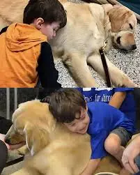Cuando Kainoa entró en la sala donde lo esperaba Tornado, nadie sabía qué esperar. Pero ocurrió algo extraordinario: el niño corrió hacia el perro, se recostó sobre él y, por primera vez, se relajó por completo. No hubo miedo ni resistencia, solo paz. La madre, conmovida hasta las lágrimas, presenció un momento que parecía inalcanzable: el primer gesto espontáneo de afecto de su hijo.