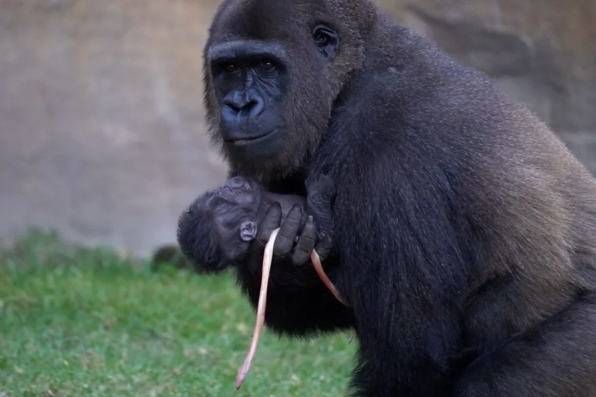 Tras el nacimiento, la madre mostró un fuerte instinto maternal: limpió, olfateó y sostuvo al recién nacido con ternura. El grupo de gorilas se acercó con cautela para observar al nuevo miembro. Wefa rompió el cordón umbilical y consumió parte de la placenta, una conducta habitual entre gorilas que les proporciona nutrientes esenciales.