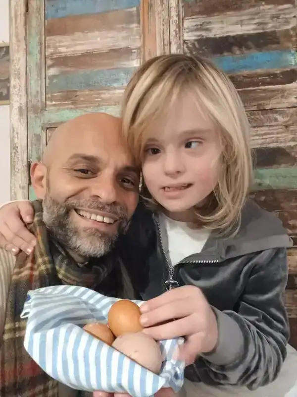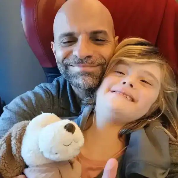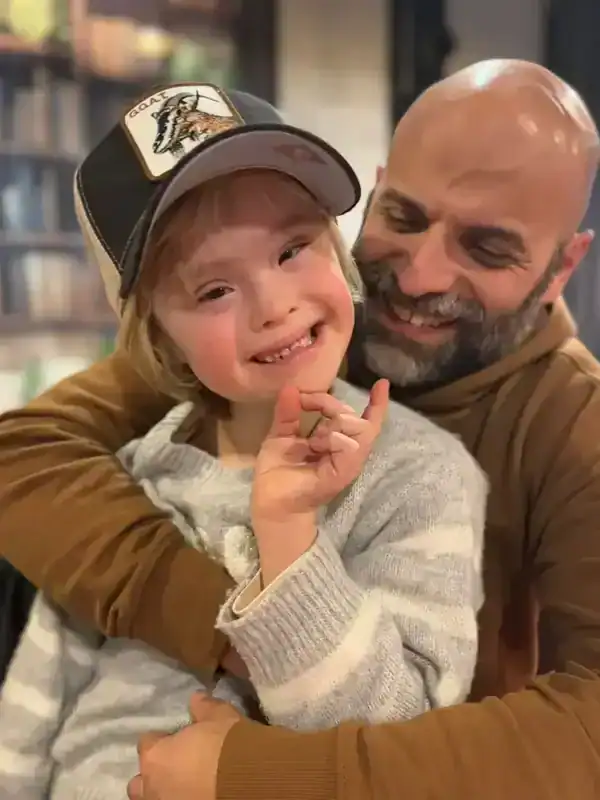 Luca recuerda con emoción el primer encuentro con Alba: «Fue la primera vez que recogía a un recién nacido en mis brazos. Inmediatamente sentí que ella era mi hija. Cuando vi a Alba, supe que estaba listo para ser su padre». Desde entonces, padre e hija han ido sorteando juntos los retos habituales de cualquier familia y también los específicos que conlleva una discapacidad cognitiva leve a moderada. Alba asiste a un colegio inclusivo donde recibe apoyo individualizado y participa en actividades artísticas y deportivas.